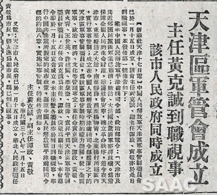 5. 1949年1月19日,《人民日報》關(guān)于天津區(qū)軍管會成立的報道