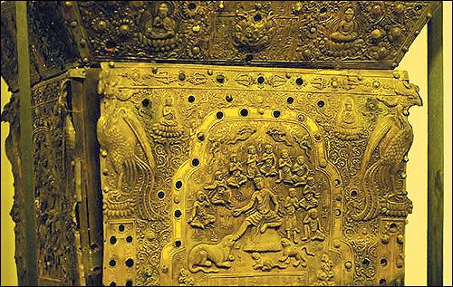 記者了解到,塔王被請出后的第一件事就是“擦澡”,專家用蒸餾水、棉花在塔王的表面一點點地擦洗,如今,凡是見過它的專家都會驚艷,去除蒙塵的塔王散發(fā)出金色的光澤,表面布滿了大大小小的雕刻圖案,如果加上20多幅故事圖畫上的人物,阿育王塔佛像人物像共超過了100個,舉世罕見。其中,佛祖釋迦牟尼生平故事以連環(huán)畫的形式雕刻在8片山花蕉葉上,每片上有2-3個故事,共約20幅圖案分別描述了六牙白象入夢、佛祖誕生、菩提樹下證道、佛祖涅槃等20個故事。
