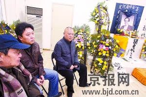 張文順先生的靈堂設(shè)在天橋樂茶園旁邊的德云書館里,面積不大但布置得整潔肅穆,張文順生前的一張黑白照片擺在靈堂正中,左右兩邊是郭德綱親筆書寫的挽聯(lián),花籃和花圈圍繞著整個(gè)靈堂,兩邊的墻上則掛滿了張文順的徒弟張德武、德云社演員何云偉、李菁等人書寫的祭幛。