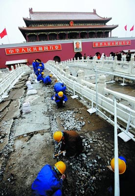 為迎接新中國(guó)成立60周年,天安門(mén)金水橋從昨日起開(kāi)始修繕。天安門(mén)管委會(huì)昨日消息稱(chēng),此項(xiàng)工程預(yù)計(jì)在5月1日前完工。來(lái)自北京市文物局官網(wǎng)的招標(biāo)公告顯示,工程財(cái)政撥款資金94.64萬(wàn)元。