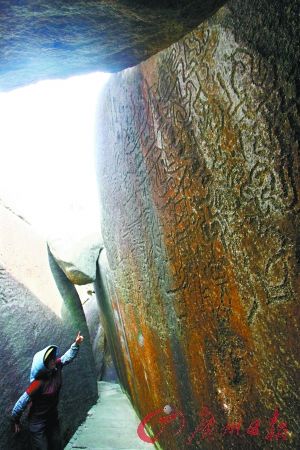 我們沿山路攀爬港灣旁邊的風猛鷹山,不久便到達其中最大一幅巖畫所在地:藏寶洞。從遠處看,這只是一堆巨大的花崗石巖體,若從空中俯視,可以發(fā)現(xiàn)它像一只碩大的海蚌,微微張開一條縫,而巖畫就刻在這花崗石崩裂兩瓣后的平整的巖面上(見主圖)。