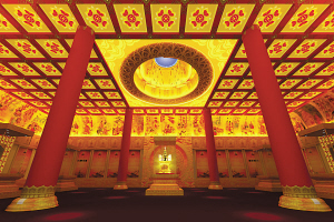 走進展覽大廳,正中間就是出土于南京大報恩寺遺址名揚四海的七寶鎏金阿育王塔的主展區(qū),設(shè)計師用“天圓地方”來形容他對核心之處的設(shè)計理念。崇圣殿的大廳內(nèi)從地面到屋頂估計有9米高,記者看見施工單位搭起了3層高的腳手架,幾名工人正在為圓頂上色,“圓頂共制作了三圈,最大的一圈直徑2.4米,一圈比一圈縮小,這樣可以體現(xiàn)出一種神秘的層次感。18幅飛天壁畫盤旋在圓頂周邊,最高一圈內(nèi)畫上藍(lán)色的夜空,然后安裝LD最新燈光系統(tǒng),16盞射燈對應(yīng)的地方是方形的仿漢白玉基座,座上四邊是進口的鋼制廊桿!庇浾咦铌P(guān)心的是基座上究竟陳列什么文物?無疑是大家都想要看到的,美麗無比的七寶鎏金阿育王塔。