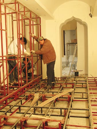 隨后,記者從左邊的長廊向大成殿的后方――冶山坡邁進。高大的崇圣殿外一片繁忙景象,寬大的平臺上,10多名工人正在搭著鐵架,這里將是開幕儀式的主要場地,28日那天,來自全世界60個國家和地區(qū)的佛教高僧和各界貴賓將再次舉行一個特殊的盛典。而這處崇圣殿將是阿育王塔等文物的展覽圣地。