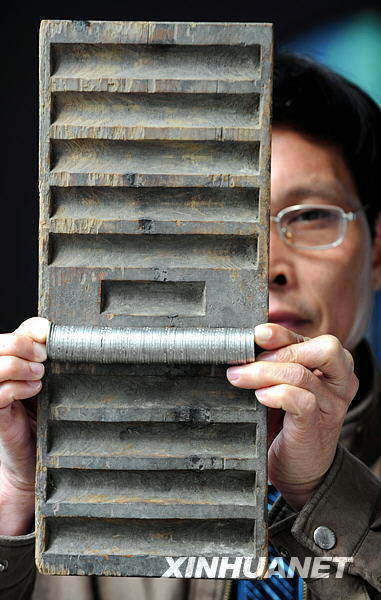 據(jù)介紹,這塊清代使用的“點(diǎn)鈔機(jī)”狀似算盤,長(zhǎng)37厘米,寬16厘米,內(nèi)刻有11條凹槽,直徑同當(dāng)時(shí)流通的銅幣直徑吻合,其中10條長(zhǎng)凹槽可一次性勘驗(yàn)1000枚銅幣,中部的一條短凹槽可勘驗(yàn)50枚銅幣。新華社記者彭張青攝