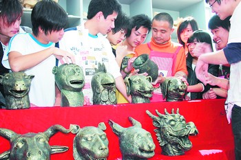 前段時(shí)間,法國(guó)佳士得拍賣(mài)行拍賣(mài)圓明園流失文物鼠首和兔首銅像,此事經(jīng)媒體報(bào)道后在全國(guó)引起巨大反響,也激起了長(zhǎng)沙師范學(xué)校師生的憤怒!爱(dāng)時(shí)關(guān)于十二生肖銅像的話題很熱,我覺(jué)得若是仿制出十二生肖銅像,豈不是對(duì)學(xué)生進(jìn)行愛(ài)國(guó)主義教育的好素材?”仿銅十二生肖獸首制作者的指導(dǎo)老師錢(qián)正財(cái)告訴記者。錢(qián)老師將這個(gè)想法跟自己的學(xué)生們一說(shuō),大家都很感興趣。于是他從所教的學(xué)生中確定12人,每人負(fù)責(zé)一個(gè)仿銅獸首的制作。