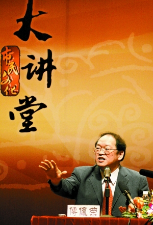 傅:父母親現(xiàn)在很年輕,孩子很小,他拼命培養(yǎng),但是他沒有想到,孩子太杰出的話,晚年就很冒險了。為什么?杰出的孩子,恐怕要為天下人服務(wù)去了。像在臺灣就有一個例子,一對老夫婦,生了八個孩子,全部到美國去,最小的那個都拿到了碩士,還有一個院士,都很有成就,但是兩老沒有人管,最后他們子女說,到美國來吧。他們?nèi)チ艘荒昃突貋砹,說不愿意當(dāng)游牧民族,這一家住一個月,那一家住兩個月,這怎么是人的生活呢。就回到臺灣去,最后老太太過世,留一張條子給她先生,你還是跟我走吧。最后老先生也過世了。像這樣的故事,你看了就會說,這一對老夫妻,年輕的時候,好好地培養(yǎng)他們的孩子,孩子長大之后要孝順你,他也是兩面為難。因為是一個人才,他就不能只顧自己,要負責(zé)實驗室里面的東西,要替很多人策劃。