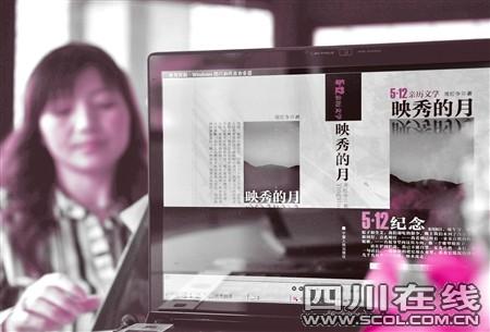 “你好,我是周紅令!毕挛2點(diǎn),周紅令帶著筆記本電腦出現(xiàn)在記者面前,她蓄著優(yōu)雅的長(zhǎng)卷發(fā),素雅的條紋襯衫剪裁合身。在成都鬧市,她有兩家玉石門(mén)市,是個(gè)有些小資的女老板。周紅令打開(kāi)電腦,已經(jīng)排好版的作品《映秀的月》快速閃過(guò),一張地震時(shí)渾身是泥的照片,讓她有些羞赧。
