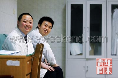 在整容室里,因?yàn)橥g,張洋和張祺關(guān)系很好。張祺相對活潑點(diǎn),他跟張洋講起昨晚做過一個(gè)夢,夢見一哥們掉水里了。在夢里他哈哈地樂著!鞍滋觳荒苄,晚上做夢才能笑!睆堨靼腴_玩笑地說。有時(shí)候,哥倆做久了這份工作也感到壓抑,晚上必須找朋友喝酒。朋友都會(huì)好奇他們的工作,都覺得怎么也得一月上萬。張洋跟記者嚴(yán)肅澄清:真的只有3000多,非常普通的工資標(biāo)準(zhǔn)。