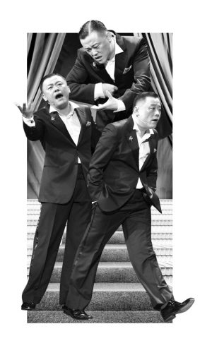 在周立波的《笑侃大上!分,最能引起臺(tái)下中年觀眾共鳴的就屬“文革”片段,錢文忠分析它之所以能產(chǎn)生如此強(qiáng)烈的“笑果”,除了勾起這一輩人的獨(dú)特記憶外,“他將‘文化大革命’說(shuō)成‘文化革大命’,其實(shí)是很睿智地指出了文革中種種荒唐可笑的現(xiàn)象!倍芰⒉ㄒ愿阈ι踔磷猿暗姆绞綘砍隽宋母锏倪@段記憶,也在無(wú)形中解開了一個(gè)民族的心結(jié)。