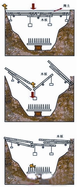 所謂連環(huán)翻板,即在墓道中挖掘深約3米以上的陷坑,長(zhǎng)短與寬度視墓道具體情形而定,坑下分布約10厘米左右的刀錐利器?由蠈悠礁矓(shù)塊木板,木板中間有軸,下綴一小型相同重量的物體,呈天平秤狀,板上有掩蓋物。若盜墓者踏上木板,板的一端隨之下陷,人必掉到坑內(nèi)的刀錐之上。