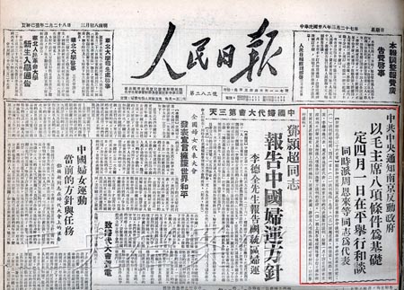 2. 1949年3月27日,《人民日報》關(guān)于中共中央通知南京政府定四月一日在平舉行和談的報道