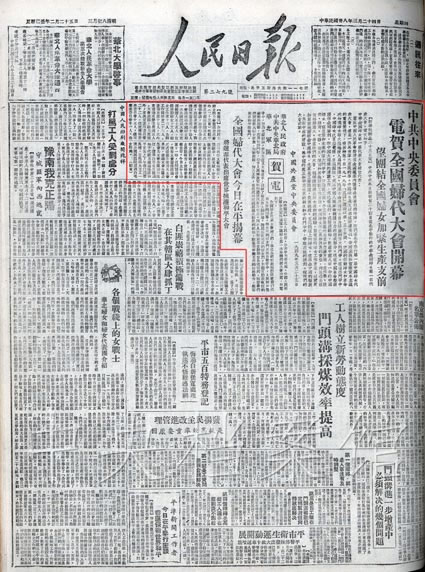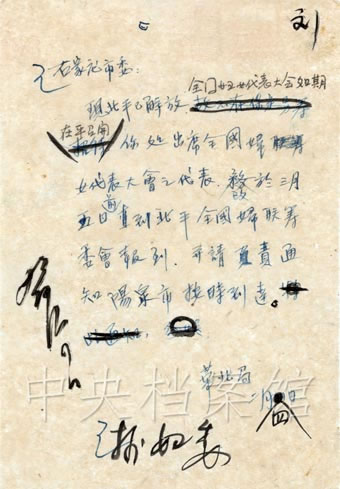 1949年3月24日——4月3日,第一次全國(guó)婦女代表大會(huì)在北平召開。毛澤東接見(jiàn)了全體代表,并為大會(huì)題詞:“為增加生產(chǎn),為爭(zhēng)取民主權(quán)利而斗爭(zhēng)!敝泄仓醒胫码娮YR。