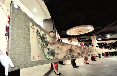 經(jīng)過37位設(shè)計(jì)師1年半時(shí)間的研發(fā),18位專業(yè)高級(jí)繡師歷時(shí)180多天、巧奪天工的繡制,長(zhǎng)22米的《清明上河圖》十字繡,昨晚在成都首次公開亮相。這幅特殊的十字繡總共使用了116505米繡線,共計(jì)2032611針,重達(dá)20600克,是目前世界上最長(zhǎng)的十字繡藝術(shù)品。18位技師從2008年7月20日起開始繡制,至2009年1月20日完工,共繡制人物814人,動(dòng)物83匹,船只29艘,房屋樓宇30多棟,車13輛,轎8頂,橋17座,樹木180棵,人物往來衣著不同,神情各異,栩栩如生。作品將在第二屆非物質(zhì)文化遺產(chǎn)節(jié)上正式展出。