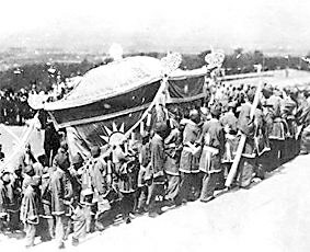 第一路段是從北平西山的碧云寺至前門的火車站,采用人力。這一路段原本計劃使用汽車,但需要事先對碧云寺至西直門長達48華里的馬路進行徹底大修,時間緊迫,難以實施,最后還是“決用杠夫奉移”。迎櫬專員辦事處最終選定專營“紅白喜事”的西長安街日升杠房,雇用杠夫共分3班,每班除64名杠夫外,還有撥旗夫、拉幌夫、以及負責遺像亭的夫役等等,總?cè)藬?shù)為283名,一律著藍白兩色的統(tǒng)一服裝。在整個移靈“奉安”過程以及南下途中每一次更換交通工具、直至最后將孫中山的棺槨安放入墓,均由他們負責。