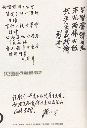 大約過了兩三天,《中國青年》雜志編輯部的同志打電話到毛主席辦公室,詢問主席是否已經(jīng)答應寫題詞。當時,我了解毛主席已經(jīng)看過《中國青年》雜志的信,但未作什么表示,我便如實地轉(zhuǎn)告。他們說,《中國青年》雜志在3月1日出版,能否請主席在2月25日前寫好,因為印刷還需要一周的時間。我將他們的要求報告了毛主席。毛主席讓我先擬幾個題詞供他參考。我回辦公室,思索了一番,擬好了十來個題詞,立即送給他。我現(xiàn)在還可以回憶起幾個題詞的大致內(nèi)容。如:“學習雷鋒同志全心全意為人民服務的思想”、“學習雷鋒同志鮮明的階級立場”、“學習雷鋒同志艱苦樸素的作風”、“學習雷鋒同志毫不利己專門利人的優(yōu)良品德”,“學習雷鋒同志勤奮好學的精神”等等。