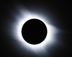 一旦太陽被完全遮住,你可以看到日冕的整個光環(huán),它的亮度和滿月差不多。通常,因為藍色的太空你看不到它。