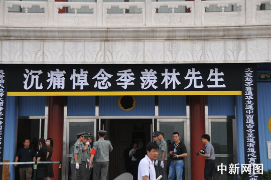 中新網(wǎng)7月19日電 (張中江) 著名國學(xué)大師季羨林先生的遺體告別儀式今日上午在北京八寶山革命公墓東禮堂舉行,靈堂外一副“沉痛悼念季羨林先生”的黑色挽聯(lián)格外醒目,上聯(lián)為“文望起齊魯通華梵通中西通古今至道有道心育英才光北大”,下聯(lián)為“德譽貽天地辭大師辭泰斗辭國寶大名無名性存淡泊歸未名”。