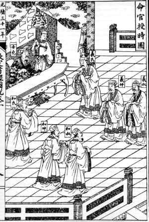 制定歷法,就是“觀象授時(shí)”,對(duì)統(tǒng)治者來(lái)說(shuō)是最重要的事情。天文歷法象征著帝王“君權(quán)神授”的統(tǒng)治權(quán)威。傳說(shuō)堯帝就命天文學(xué)家羲、和二氏進(jìn)行天文觀測(cè)以制定歷法!渡袝(shū)·堯典》說(shuō):“乃命羲和,欽若昊天,歷象日月星辰。”當(dāng)時(shí)是以觀測(cè)日出方位和黃昏時(shí)中天的恒星來(lái)確定季節(jié)。根據(jù)書(shū)中記錄的“中星”天象,可以推斷堯帝“觀象授時(shí)”的年代約在公元前23世紀(jì)。當(dāng)時(shí)制定的歷法是一年有366天,以置閏月的方法保持與季節(jié)同步。
