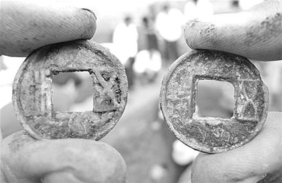 考古人員的動作越來越輕,墓葬的北頭、中部不斷有銅錢被發(fā)掘出來。經(jīng)現(xiàn)場的考古人員確認,這些都是漢代的五銖錢。記者看到,這些方孔銅錢上的“五”、“銖”兩字十分明顯。