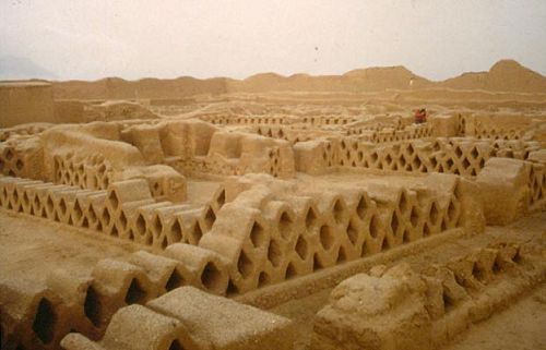 昌昌古跡位于太平洋海岸,是奇穆文明(Chimúcivilization)的首都。奇穆文明大約始于公元850年,消亡于1470年。土城城區(qū)是帝國的權(quán)力中心,帝國從厄瓜多爾南部延伸到秘魯中部,綿延1000多公里。15世紀時城市的居民達6萬人,大部分是工人,服務(wù)于極權(quán)君主,還有高級手藝人和神父。那是個嚴格的世襲等級社會:奇穆神話說,太陽用三個蛋創(chuàng)造了人類,金蛋孵出了統(tǒng)治者,銀蛋孵出了統(tǒng)治者的妻子,銅蛋孵出的是大眾。