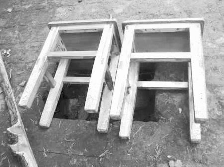 該“地洞”位于景區(qū)碑座南約20米處,神道的東側(cè)。洞口長約40厘米,寬約20厘米,目前,四周已被一條鐵鏈圈住,一個“小心地滑”的警示牌放在一旁,兩把椅子橫在洞口。透過縫隙向下看,該洞呈圓形,洞底距離地面約有50厘米,里面有一些雜物,洞口周圍的青磚,也出現(xiàn)了松動跡象。