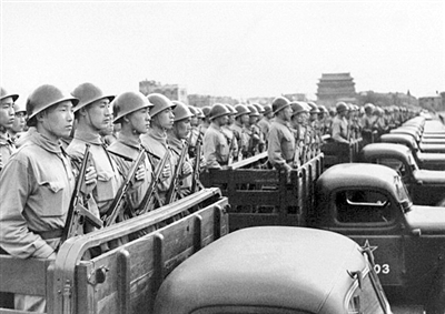 陸、海、空三軍佩戴統(tǒng)一制式的帽徽和胸章,著50式軍服受閱,整齊劃一,面貌一新。新中國成立后我軍第一次有了統(tǒng)一制式、統(tǒng)一標(biāo)準的軍服。