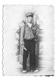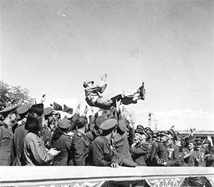 閱兵結(jié)束后,張百川跟同學(xué)們紛紛跑到照相館拍照留念。大家都穿著閱兵時(shí)的裝束:為閱兵專門配發(fā)的綠色飛行員帽子、上衣,白色襯衣,腳上穿著咖啡色的仿毛皮鞋。張百川介紹說(shuō),原本發(fā)的是普通的軍用膠鞋,為了踢正步時(shí)鏗鏘有力,特意發(fā)放了這樣的皮鞋,據(jù)說(shuō)是抗日時(shí)繳獲日軍的。
