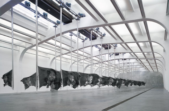 每天晚7點(diǎn)是尤倫斯當(dāng)代藝術(shù)館閉館的時(shí)間。大展廳里震耳欲聾地響了一整天的鼓風(fēng)機(jī)停了。34 幅被吹得呼啦啦飄揚(yáng)的旗幟以及旗幟上34 張嬰兒的臉也隨著風(fēng)力消失,癱軟下來,耷拉在旗桿上。仿佛大退潮,展廳盡頭的灰色風(fēng)景墻露了出來,那面墻上畫著沒有人煙的山頭。遠(yuǎn)望去,旗桿如墳?zāi)股系钠鞄,遍插山地?/p>