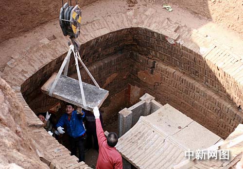 據(jù)了解,八月下旬,西安國(guó)家民用航天產(chǎn)業(yè)基地在長(zhǎng)安杜陵塬上修建道路時(shí)發(fā)現(xiàn)一座古墓,西安市文物保護(hù)考古所經(jīng)過(guò)清理發(fā)掘,使這座唐代廡殿式石槨墓葬完整地展現(xiàn)在世人面前。九月二十七月,考古人員將這座墓葬內(nèi)的文物實(shí)施整體搬遷。首先對(duì)墓葬內(nèi)的石槨進(jìn)行拆解編號(hào),隨后用吊車(chē)將每塊文物起吊到地面上用毛氈包裹,用龍骨、鐵絲加固后裝上一輛封閉式的卡車(chē)內(nèi)。