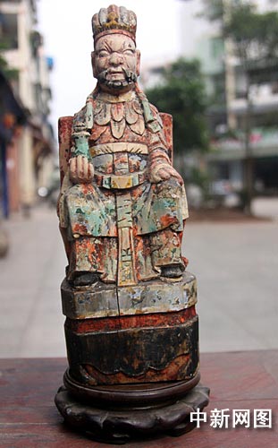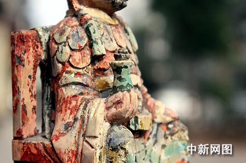 中新網(wǎng)成都9月28日電(劉龍泉)9月28日,記者在四川長(zhǎng)寧縣城“永勝收藏館”里看到了一尊“酒圣公”木雕神像。該神像用柏木雕成,寬11厘米,相高22厘米,連座高30厘米;神像為男性,坐在太師椅上,頭戴孔明帽,眼睛大而突出,胡須濃密,一副文武兼?zhèn)涞臉幼。他的左手放在左大腿上,右手則向上持有一酒瓶,酒瓶上蓋有木塞。