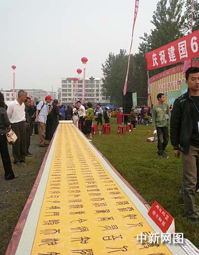中新社襄樊9月29日電 (涂玉國(guó))長(zhǎng)一百一十米、寬零點(diǎn)八米,用五種字體書寫的毛主席詩詞的書法長(zhǎng)卷,二十九日在湖北省襄樊市谷城縣博覽會(huì)上現(xiàn)身。這是該縣文化館副館長(zhǎng)、書法美術(shù)家協(xié)會(huì)主席許祥強(qiáng)為慶祝新中國(guó)成立六十周年而作。