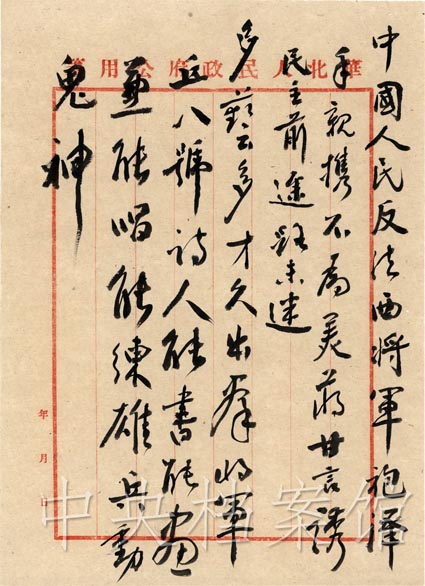 1949年 9月 1日,馮玉祥遇難周年祭日追悼會(huì)在北京舉行,出席者有李濟(jì)深、宋慶齡、周恩來、沈鈞儒、張瀾、何香凝、郭沫若、林伯渠、吳玉章、董必武及馮玉祥夫人李德全等 600余人。毛澤東、朱德及各民主黨派、各人民團(tuán)體送了挽聯(lián)花圈。毛澤東親筆題詞: “馮玉祥將軍逝世周年紀(jì)念謹(jǐn)致悼意。 ”周恩來在致詞中說:馮玉祥先生從一個(gè)典型的舊軍人轉(zhuǎn)變成為一個(gè)民主的軍人,他經(jīng)過了曲折的道路,最后走向新民主主義的中國。馮先生堅(jiān)決地拒絕了美帝國主義對(duì)他的誘惑,毅然離美準(zhǔn)備回到中國解放區(qū),接受參加新政治協(xié)商會(huì)議的號(hào)召,不幸遇難,實(shí)值得大家紀(jì)念。