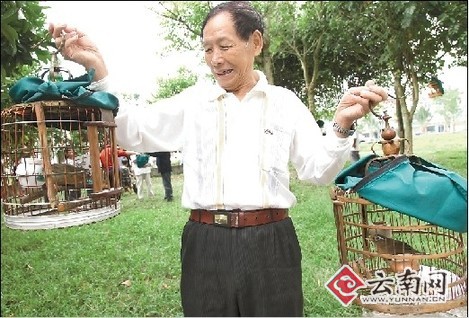 上午11點(diǎn),結(jié)束了當(dāng)天的鳥市后,勐捧農(nóng)場武裝部職工何保平的一只畫眉鳥得到了冠軍!氨緛砣ツ暧腥碎_價1.5萬元都沒有搞到手,不過今年由于它原來的主人忙著要去打理生意,被我3600元就撿個大便宜買了下來!焙伪F脚d奮地對記者說:“不過,我們這里有一個沒有人敢挑戰(zhàn)的鳥王!闭f話間,他將記者領(lǐng)到了一位正把玩著兩個鳥籠、精神矍鑠的老人面前,告訴記者,他就是這一帶公認(rèn)的“鳥王”張陸成。