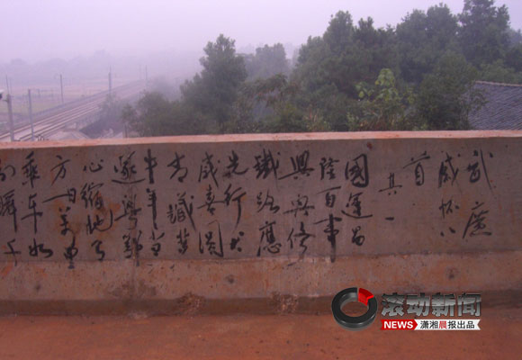 “太有才了!如此流暢的書法作品,的確為鐵路建設(shè)增色不少!本W(wǎng)友“龍?zhí)t”在紅網(wǎng)論壇發(fā)《水泥墻上見功底武廣橋上一奇葩》,帖中曝料他在武廣高速鐵路客運專線上的一跨線橋的擋墻上,拍到建橋人如行云流水一般的書法作品。據(jù)當?shù)刂槿苏f,這些書法作品是其中一位承建包工頭建完橋后有感而書的。