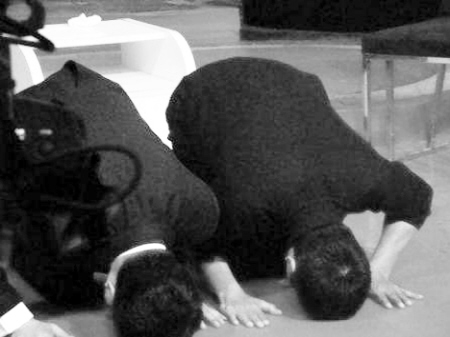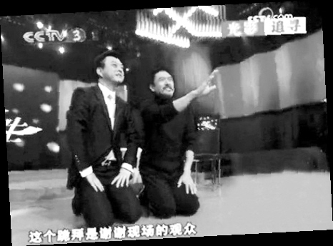 周潤發(fā)(突然拉著朱軍,面對現(xiàn)場觀眾跪了下來):讓你感受一下《孔子》是如何復(fù)原兩千年前的真實生活的。(接著以額貼地,實實在在地給觀眾叩了一個頭)這個跪拜是謝謝現(xiàn)場的觀眾。