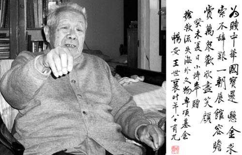2002年搶救流失海外文物專項基金成立,邀請王世襄先生擔(dān)任顧問,他欣然應(yīng)允。他說,被掠奪的文物,如龍門、云岡石窟被盜掘的文物,應(yīng)該無償追回。這些文物必須歸還回原地,因為他們是土生土長的,根在國內(nèi),是上下相連的。王世襄先生對成立一個以搶救流失文物、保護文化遺產(chǎn)的公益組織頗感快慰。興奮之余他賦詩一首:為贖中華國寶還、懸金求索不辭艱。一朝展館容瞻賞,萬眾歡欣盡笑顏。