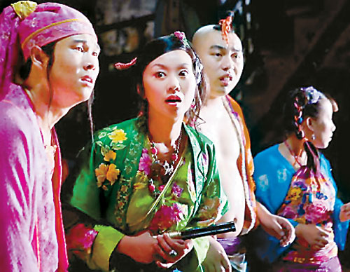 其一,全片表現(xiàn)以“鬧劇”式的敘事假定性(擬古而又將年代模糊化,中英語錯(cuò)雜使用),劇中角色一個(gè)個(gè)俱成了從屬于“無厘頭化”情節(jié)進(jìn)程的符碼,遺去原版人物之“神”而僅存其形、其皮,全都平庸而了無新意。諸如張三、李四、王麻子再饒上兩個(gè)添油加醋的小小伙計(jì)趙六與陳七(毛毛扮演);ㄉ200萬美金買來的這個(gè)版權(quán),如此做法,不但堪稱極盡奢侈的浪費(fèi),同時(shí)也標(biāo)示了主創(chuàng)者創(chuàng)意能力的喪失而淪為匠藝般的“東施效顰”。