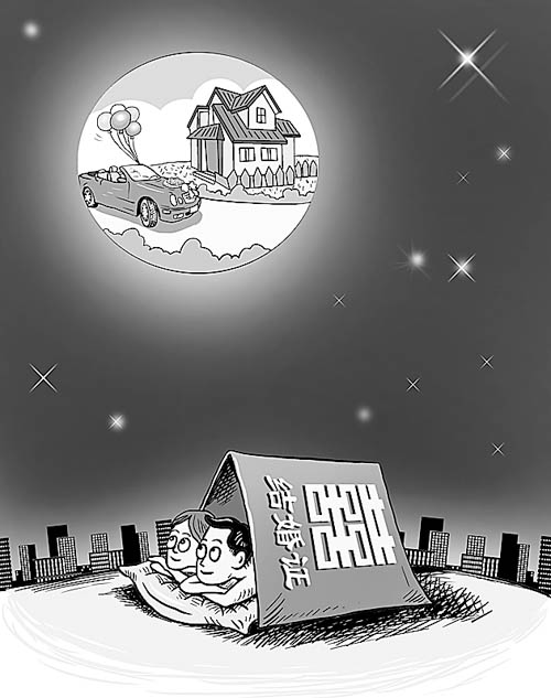 不買房,不買車,不辦婚禮,不買婚戒……除了花九塊錢去登記處辦理紅艷艷的結(jié)婚證,其他都可以不要。近來(lái),網(wǎng)絡(luò)上的一篇題為“一個(gè)裸婚者的自白”的帖子,引發(fā)網(wǎng)友關(guān)注!奥慊椤保@個(gè)在2008年全球金融危機(jī)下誕生的新詞兒,在2009年不斷上揚(yáng)的房?jī)r(jià)“助推”下迅速流行。新浪網(wǎng)網(wǎng)友“同道”稱,“‘裸婚’是高房?jī)r(jià)賜給白領(lǐng)的‘新時(shí)尚’!