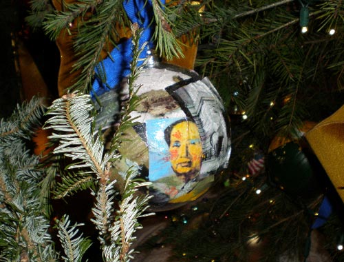 據(jù)12月25日出版的《環(huán)球時報》報道,在奧巴馬入主白宮的首個圣誕節(jié),擺放在白宮藍廳中央的一棵圣誕樹,引起外界的強烈興趣。這棵圣誕樹由奧巴馬夫人米歇爾親自“裝扮”,上面懸掛了中國領(lǐng)袖毛澤東頭像的裝飾。