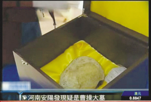 “這個(gè)墓里,發(fā)現(xiàn)石璧三個(gè),圭一個(gè)。圭壁合一,是判斷一個(gè)帝王陵墓等級(jí)級(jí)別的一個(gè)非常重要的標(biāo)準(zhǔn)!必(fù)責(zé)挖掘工作的河南省文物考古研究所副研究員、考古隊(duì)隊(duì)長(zhǎng)潘偉斌說(shuō)。據(jù)介紹,除上述器物外,該墓還出土有大量畫(huà)像石殘塊。這批畫(huà)像石畫(huà)工精細(xì)嫻熟,雕刻精美,內(nèi)容豐富,有“神獸”、“七女復(fù)仇”等圖案,并刻有“主簿車(chē)”、“咸陽(yáng)令”、“紀(jì)梁”、“侍郎”、“宋王車(chē)”、“文王十子”等文字,堪稱精品。在墓室清理中,發(fā)現(xiàn)有人頭骨、肢骨等部分遺骨,專家初步鑒定為一男兩女3個(gè)個(gè)體,其中墓主人為男性,年齡在60歲左右,與曹操的卒年66歲相吻合。經(jīng)研究,認(rèn)定這座東漢大墓為文獻(xiàn)中記載的魏武王曹操高陵。