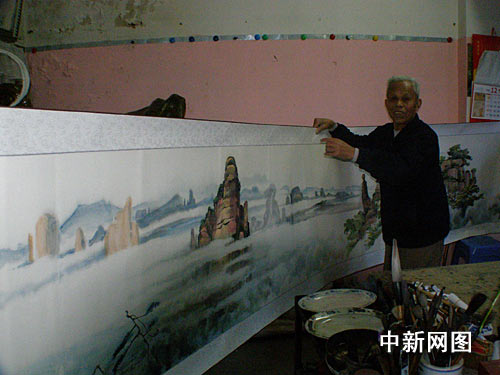 中新網韶關12月29日電 (馮昶 袁少洪)年近八旬的中國畫家譚飛彬老先生為支持丹霞申遺而創(chuàng)作的三十米國畫《丹霞山》,今日完成。