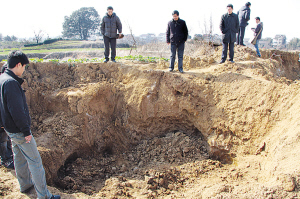 一同前來的南京市博物館考古部工作人員表示,此地距離固城遺址只有不足千米的距離,從現(xiàn)場(chǎng)推斷,這里至少有10余座兩漢時(shí)期的墓葬,而且多是兩漢時(shí)期的貴族墓。從現(xiàn)場(chǎng)的挖土機(jī)的抓痕可以看出,這是有目的的盜掘行為。敢于開著挖土機(jī)盜挖古墓群的現(xiàn)象,無論在南京還是在江蘇甚至全國,都可以說是盜墓史上的第一次出現(xiàn),性質(zhì)相當(dāng)惡劣。