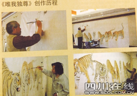 一個小時之后,事情出現(xiàn)了非常戲劇性的變化。不少關(guān)于《惟我獨尊》的照片和畫冊在同城某大廈的會議室里出現(xiàn),這里正召開一場關(guān)于“打虎”的新聞發(fā)布會,發(fā)布會的發(fā)起人尹青,是畫家孟祥順的好朋友,也是一名成都的律師,這次他是以孟祥順特別代理人的身份緊急約見成都媒體。尹律師義憤填膺地說:“現(xiàn)在正在長江畫院展覽的《惟我獨尊》是百分之百的假貨,