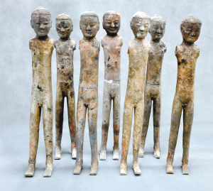 “這些陶俑與漢陽陵的陶俑相似,大約60厘米高!睆堉倭⒄f,現(xiàn)在雖然看著陶俑都是赤身裸體,沒有胳膊,但在胳膊處都留有孔,而在坑內(nèi)專家們還發(fā)現(xiàn)了盔甲的殘片,可見這些陶俑原先都穿有各種各樣的衣服。而在坑內(nèi),出土了大量的兵器銅鏃、刀、箭等,還有十分少見的6金6銅的青銅鐘,還有做飯用的陶釜。