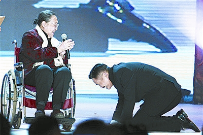 被譽(yù)為2010中國(guó)第一史詩(shī)巨片的《孔子》,1月中旬在北京舉行首映慶典,慶典上孔子的第77代嫡孫女孔德懋女士坐著輪椅上臺(tái),周潤(rùn)發(fā)便一直在旁邊像子侄一樣跪著聽老太太講話?椎马渴①澲軡(rùn)發(fā)在電影《孔子》中飾演孔子的精彩表演,并將寫有“永遠(yuǎn)的孔子”的橫幅贈(zèng)送給發(fā)哥。這時(shí),周潤(rùn)發(fā)出人意料地向孔女士認(rèn)真雙膝跪地叩首,隨后,與孔女士溫情擁抱,場(chǎng)面令人動(dòng)容……