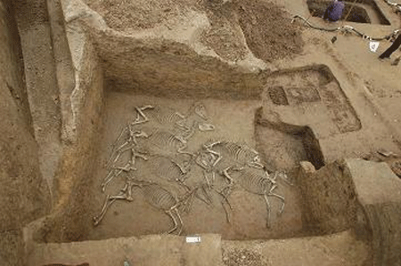墓室上口長6.2米、寬5米。墓道長15.7米。兩座墓均為南北向,人骨均已散亂,器物箱內(nèi)都放置鼎、簋、盤、匜、矛等青銅器、車馬器和陶鬲;墓道內(nèi)均隨葬兩輛馬車和一只狗。墓葬出土玉器10余件,青銅器50余件,其中8件有銘文。在大墓與祭壇之間發(fā)現(xiàn)5座馬坑和1座車馬坑。馬坑僅有馬骨架,其中一座殉馬2匹;兩座殉馬各8匹,分兩排整齊擺放;兩座殉馬各6匹,其一分兩排擺放,前2后4,另一座為兩兩成對放置,頭向不一,中間放置一件牛角。車馬坑長14米,寬3.4米。內(nèi)置3輛車,前兩輛皆四駕,后一輛兩駕。馬頭上均有精美的青銅和串貝飾件。因天氣和水位過高,現(xiàn)正在對車馬坑進行整體提取,移至室內(nèi)清理。