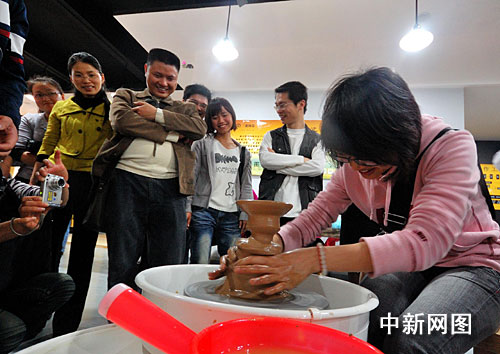 制作現(xiàn)場上,優(yōu)美動聽的古箏樂曲不停地繚繞盈耳,瓷藝家們或捏或雕,或刻或鏤,或推或接,各種傳統(tǒng)技法紛紛上陣,精彩紛呈。這行云流水般的手法、精妙細致的做工、別出心裁的設(shè)計,讓參觀者看得眼花繚亂,贊嘆不已,為之折服。人們?nèi)滩蛔∩锨懊幻毮伒拇赡啵D(zhuǎn)一轉(zhuǎn)工作盤,拿一拿精致的制作工具。前來參觀的顏小姐不禁挽起袖子也親身體驗了一回手拉坯。在轉(zhuǎn)盤的帶動下,顏小姐雙手輕拉瓷泥,那團柔軟的瓷泥仿佛有了靈性一般“舞蹈”起來,一會變成一個款嘴的大海碗,一會又變成一個細腰的小花瓶。舉著滿手的瓷泥,顏小姐開心地說:“太有意思了,讓我想起小時候玩泥巴的情景!彼表示:“下次有空的時候,我一定還要再來玩手拉坯,DIY一件作品做紀念!