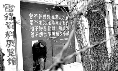 因?yàn)闆]有錢,房子已經(jīng)年久失修,展覽館內(nèi)外透著艱苦樸素,正如雷鋒精神。院外雜草荒涼,屋內(nèi)墻體裂了縫,墻上的標(biāo)語褪了色,連電燈也“罷工”。