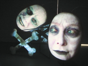 三月的雪覆蓋了林冠畫(huà)廊門(mén)前的小徑,這似乎到了觀看托尼·奧斯勒(Tony Oursler)的影像裝置的最佳時(shí)機(jī)。混沌地掉入藝術(shù)家布置的小黑屋子里,游走其間的觀者開(kāi)始不安于他的觸感,面對(duì)人類認(rèn)知的有限,由這些虛擬的畫(huà)面幻化出的立體圖像空間忽然間開(kāi)啟了一扇門(mén)。高清晰度的投影打在高低參差的柱狀體上,呈現(xiàn)的是各種品牌的香煙所經(jīng)歷的不同程度的燃燒(《香煙》):蟄伏于人內(nèi)心的欲望扭結(jié)成藤蔓狀一點(diǎn)點(diǎn)滋芽、生長(zhǎng)然后腐爛、撕裂;森然而立的香煙巨塔又如摩天怪物,從廢墟里復(fù)活,勤勉地攀爬至高處卻終至跌落和傾覆,從這里仿佛聽(tīng)到了世上眾多被無(wú)名之火吞噬的龐然大物的嘆息。來(lái)自“9·11”國(guó)度的藝術(shù)家可能沒(méi)有料到,他的香煙柱陣無(wú)形中祭奠了中國(guó)的央視塔樓焚滅于元宵煙火的厄運(yùn)。與燃燒相關(guān)的《FX》凸現(xiàn)了一個(gè)爆炸的火焰團(tuán),從中隱約見(jiàn)到一個(gè)正趨于消失的人頭,好萊塢災(zāi)難片迭現(xiàn)的恐怖主義導(dǎo)彈轟然在你面前炸響,你好似走到了地獄門(mén)前,綿延的地火緩緩地吸吮著人的精華,經(jīng)末日審判的肉身最終歸于灰飛煙滅。