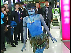 擁擠的中關村電子賣場,一位舞者化身成電影《阿凡達》里的納美人,伴隨著《大河之舞》的音樂正大跳踢踏舞,藍色的腳尖踩踏的不是地板,而是9臺筆記本……這段被市民拍下的視頻在網(wǎng)絡上瘋傳,網(wǎng)友評價其為“史上最具幻想力的商家宣傳”。